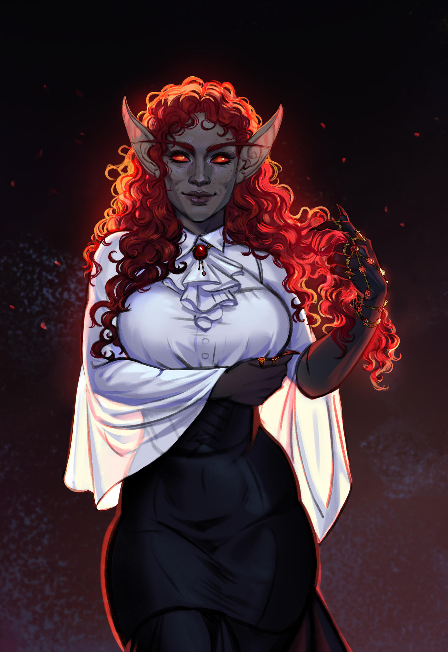 🦇 socialite: taken beneath the wing of an affluent noble, lord Emberflight, Ambessa was rarely seen outside decadent parties and no longer amidst the scholarly pursuits and academia she enjoyed. any social Thalassians may have known her as lord Emberflight's company.